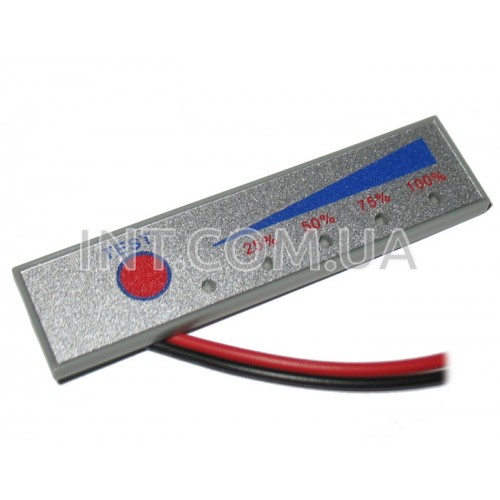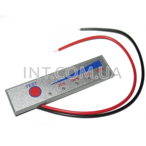 Индикатор выполнен в виде небольшой платы, на которой размещены 5 светодиодов для индикации уровня заряда и схематически изображена шкала. Если включен 1 красный светодиод - АКБ разряжен. Последующие светодиоды индицируют 25%, 50%, 75%, 100% оставшегося заряда .