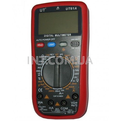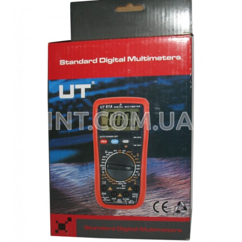 Цифровой мультиметр UNI-T UT61A предназначен для измерения постоянного и переменного напряжения, постоянного и переменного тока, сопротивления, емкости, частоты, температуры, проверки диодов, транзисторов, и прозвонки цепей. Питание от батареи типа Крона.