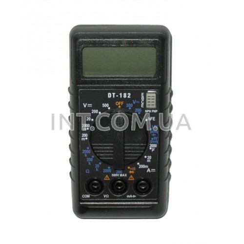 Цифровой мультиметр DT182 с питанием от одной 12-и вольтовой батареи типа A12 (A23). Предназначен для измерения постоянного и переменного напряжения, постоянного тока, сопротивления, проверки диодов, транзисторов, прозвонки цепей, проверки батареек 1.5 и 9 V. Отличается базовым функционалом и малыми размерами. Также важно отметить нестандартное питание прибора - одна 12-и вольтовая батарея типа A12 (A23).