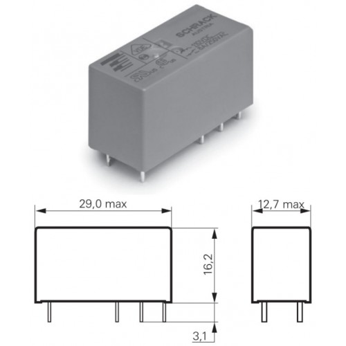 Реле RT424730 Schrack / I=8A / U=250VAC / Ucoil=230VAC / 2NO/NC / 29x13x16mm / TYCO