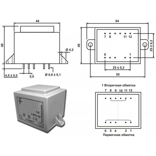Трансформатор ТН 42/20 G / P=7.5VA / Uin=220V / Uout=15V / 64х46х40mm / ТорТранс