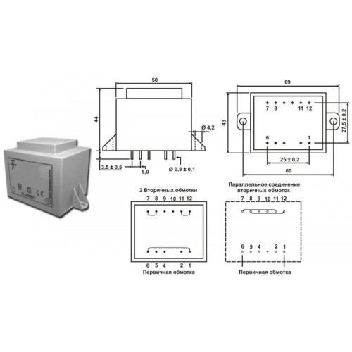Трансформатор ТН 48/25 G / P=16.0VA / Uin=220V / Uout=2x6V / 69х43х44mm / ТорТранс