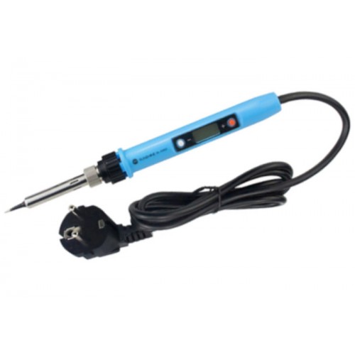 Паяльник со встроенным электронным регулятором температуры. Установлен керамический нагревательный элемент. Паяльник совместим с жалами 900-й серии. На корпусе находится цифровой регулятор для установки температуры. Установка выполняется при помощи кнопок. Регулировка в диапазоне: 180...480 °C. Установленная температура отображается на ЖКИ дисплее. Правильный подбор нужной температуры пайки значительно снижает риск теплового пробоя электронных компонентов, особенно микросхем, контроллеров, транзисторов и т.п. Также это позволяет применять различные припои и флюсы.
