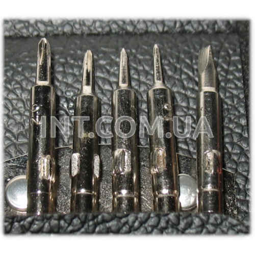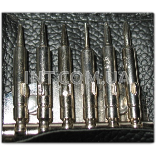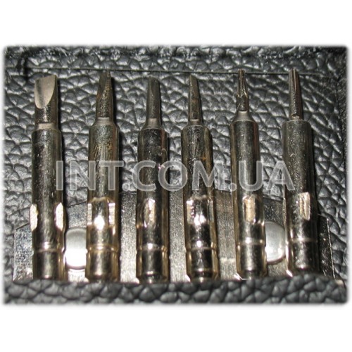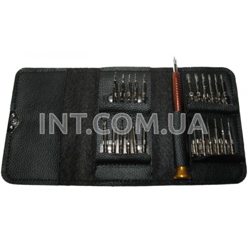 Набор отверток (25 в 1) применяется для ремонта мобильных телефонов, планшетов и другой подобной техники. Все насадки и отвертка находятся в кожаном чехле в виде кошелька.
