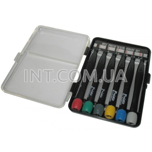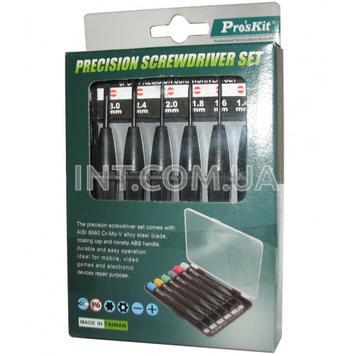 Набор отверток 8PK-2062 / Pro'sKit. В комплект входит 6 прецизионных отверток шлицевого (прямого) типа размерами: 1.4, 1.6, 1.8, 2.0, 2.4, 3.0. Каждая отвертка с нескользящим покрытием рукоятки и вращающимся упором для удобного удерживания инструмента в руке. Прочный сплав хром-ванадий-молибден. Полная длина каждой отвертки 110 mm. Поставляется в футляре.