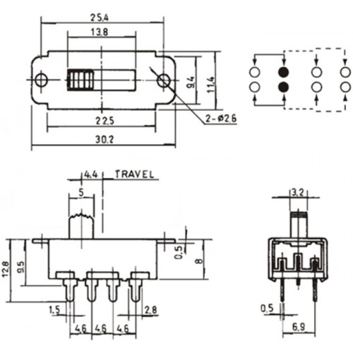 Переключатель движковый / 150VAC / 1A / 2гр. по 4 контакта / SS-23I01 / ON-ON-ON, 2P3T / Global Tone