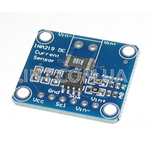 Модуль цифровой датчика тока и напряжения INA219 предназначен для измерения постоянного тока, постоянного напряжения и потребляемой мощности. Модуль выполнен на микросхеме INA219 - измерителе тока и напряжения с нулевым дрейфом и обладает высокой точностью измерений. Встроенный сигма-дельта АЦП разрядностью 12 бит позволяет программно переключать делители входа измерения тока. Это позволяет автоматически переключать полярность измерения. Данные передаются по I2C интерфейсу. Предусмотрена возможность изменения I2C адреса, что позволяют подключить на одну шину несколько модулей. Изменить адрес можно при помощи закорачивание контактов А0 и А1. Для увеличения точности измерений предусмотрен регистр калибровки.