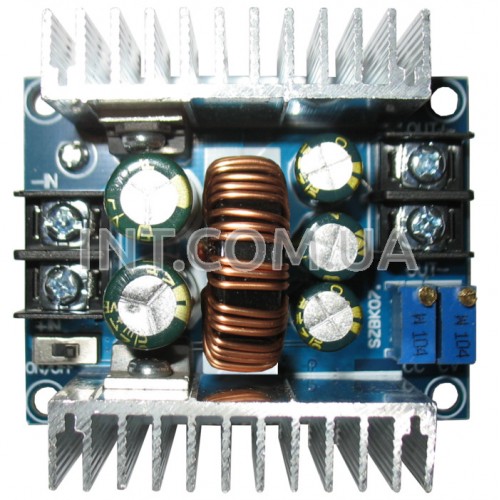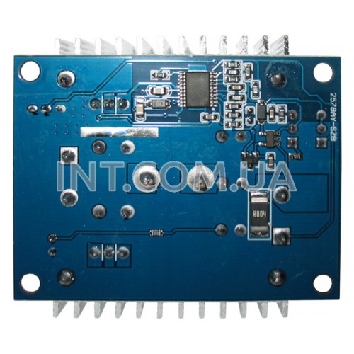 Понижающий DC-DC преобразователь с регулировкой выходного тока и напряжения. Для этого на плате установлены 2 многооборотных подстроечных потенциометра. Выполнен на ШИМ-контроллере LM25116. Выходной каскад в преобразователе выполнен на отдельных 2-х полевых MOSFET транзисторах NCE8290, которые закреплены на отдельных массивных радиаторах. Также дополнительно установлен ОУ LM321 для усиления с токового шунта сопротивлением 4 mOHm.
